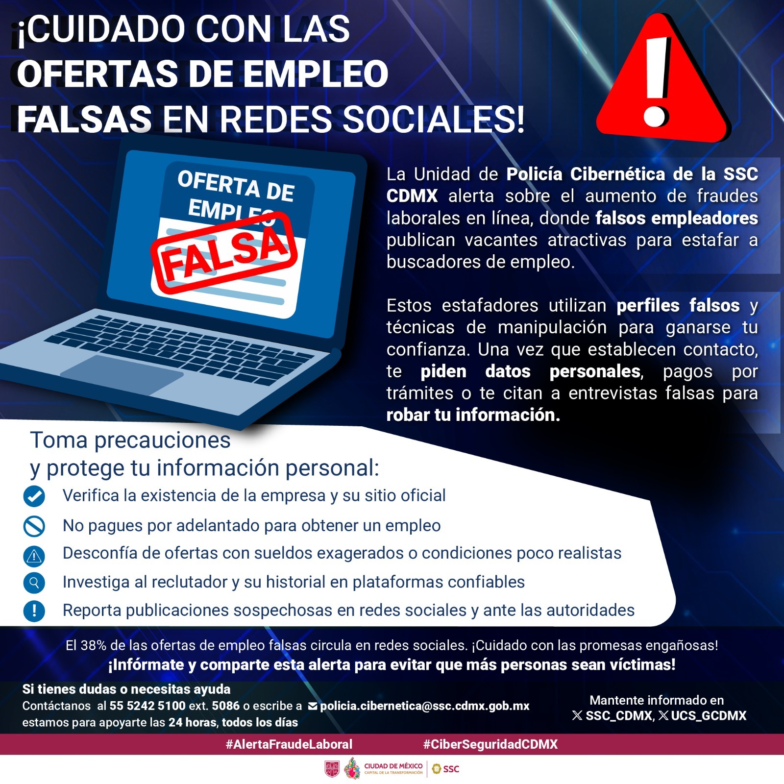 CDMX, 12 mayo 2025 (INFORMATIVODIGITAL.COM.MX).- La Unidad de Policía Cibernética de la Secretaría de Seguridad Ciudadana (SSC) de la Ciudad de México, detectó una nueva modalidad de fraude, mediante la publicación de ofertas de empleo falsas en redes sociales.