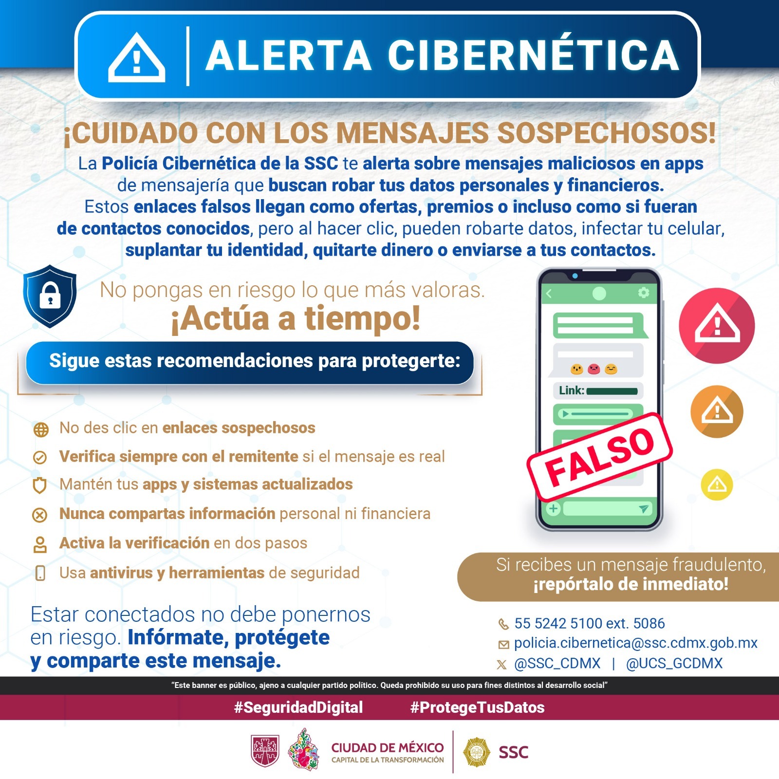 El reporte de incidentes cibernéticos 2025, señala que los incidentes ocurridos a través de dichas aplicaciones de mensajería representa el 23 por ciento, estos pueden ser de extorsión, fraude, acoso y robo de contraseñas, por lo anterior, la Policía Cibernética de la SSC exhorta a desarrollar buenos hábitos digitales, así como seguir las siguientes recomendaciones: