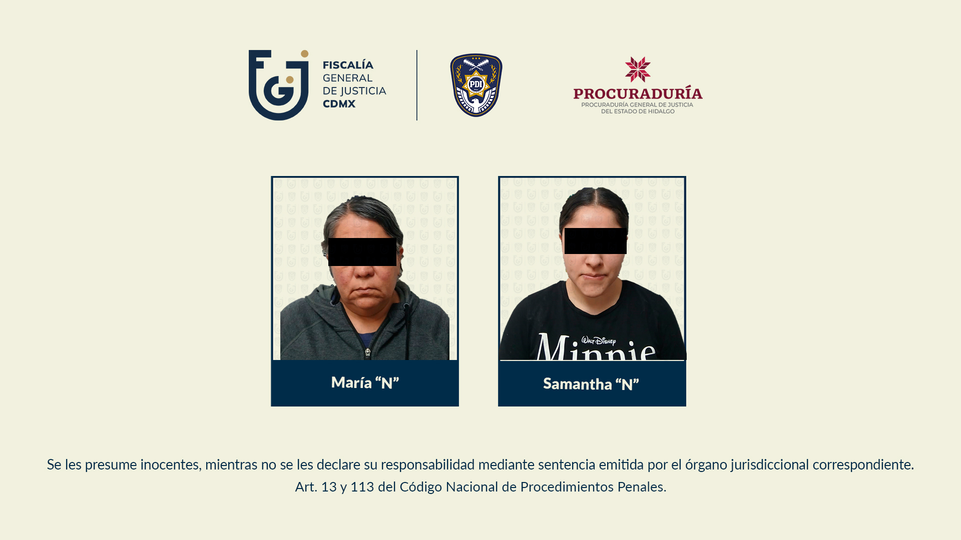 CDMX, 08 septiembre 2025.- El pasado 7 de septiembre de 2025, la Fiscalía General de Justicia de la Ciudad de México (FGJCDMX) informó la detención de María “N” y Samantha “N”, viuda e hija, respectivamente, de Felipe de Jesús “N”, alias “El Ojos”, exlíder del Cártel de Tláhuac. Ambas eran buscadas por su presunta participación en el delito de asociación delictuosa, en el marco de la continuidad operativa de esa organización criminal tras la muerte de su fundador.