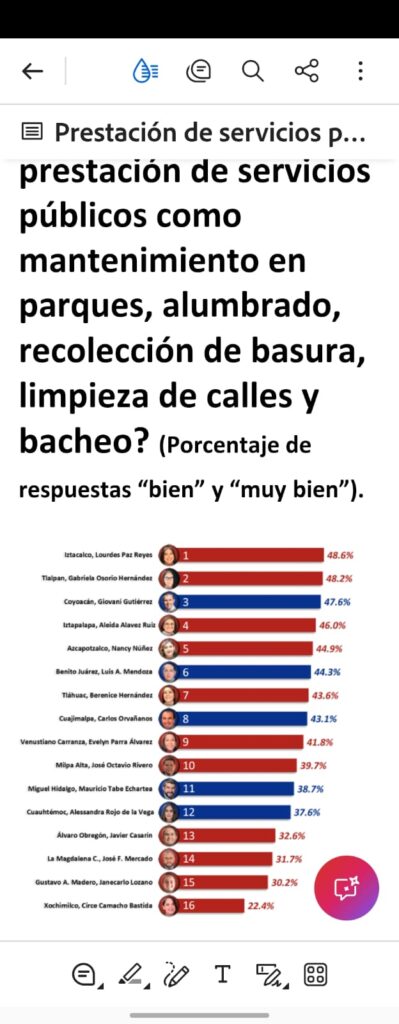 En cuanto a su trabajo realizado en la prestación de servicios públicos como mantenimiento en parques, alumbrado, recolección de basura, limpieza de calles y bacheo, Circe no da una y se mantiene en el deshonroso último puesto con el 22 por ciento, es decir, la gente de Xochimilco no tolera más su administración.