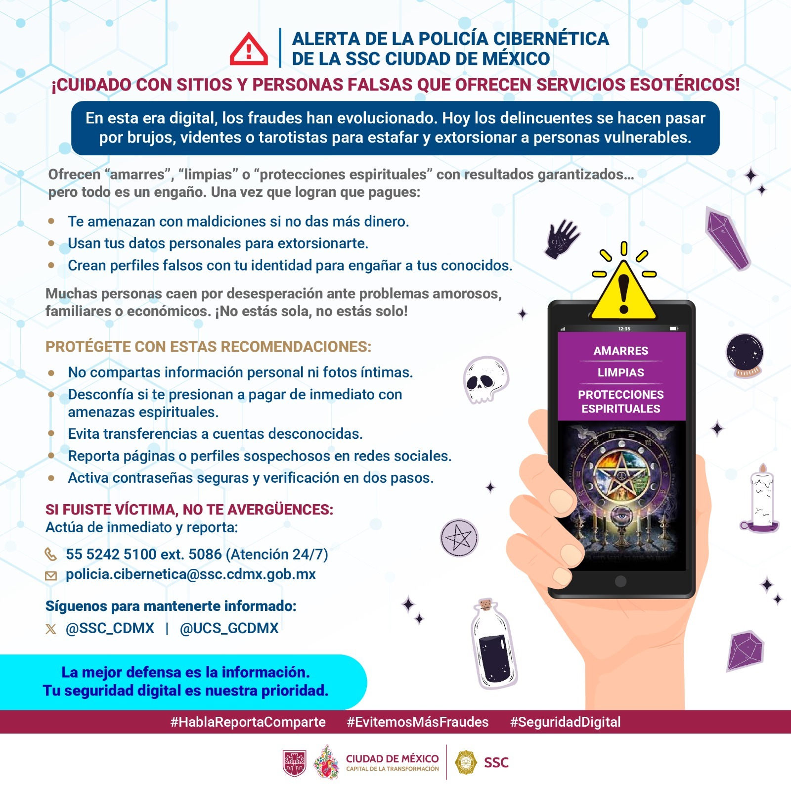 CDMX, 05 junio 2025 (LAMETROPOLI.COM.MX).- La Policía Cibernética alerta a los usuarios de la red por personas y sitios falsos que ofrecen servicios esotéricos que ofrecen servicios como amarres, limpias y otras prácticas espirituales para extorsionar, lo cual no solo representan un riesgo económico, sino que también pueden afectar emocional y psicológicamente a las víctimas.
