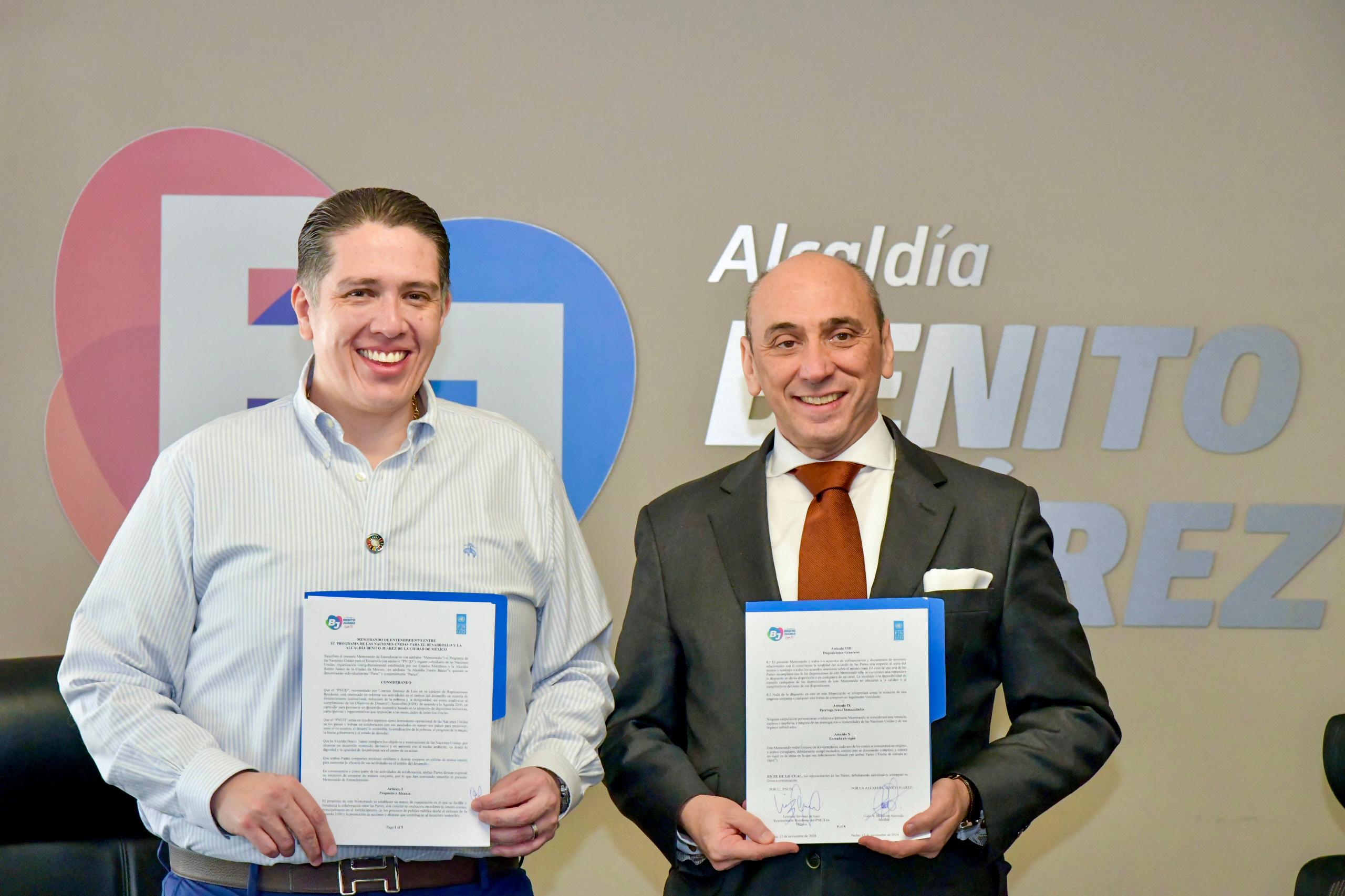 El acuerdo fue signado en las instalaciones de la alcaldía Benito Juárez por el alcalde, Luis Mendoza y el representante residente del PNUD en México, Lorenzo Jiménez de Luis en presencia de la coordinadora de vinculación internacional de la alcaldía, Dora Isabel González y Daniela Vallarino, analista de Gestión del PNUD en México.