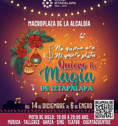 Con el lema «No quiero oro, ni quiero plata, quiero la magia de Iztapalapa», la alcaldía arrancará las festividades navideñas con un amplio programa que incluye pistas de hielo, recitales, obras de teatro y villas navideñas, diseñados para el disfrute de las y los iztapalapenses.