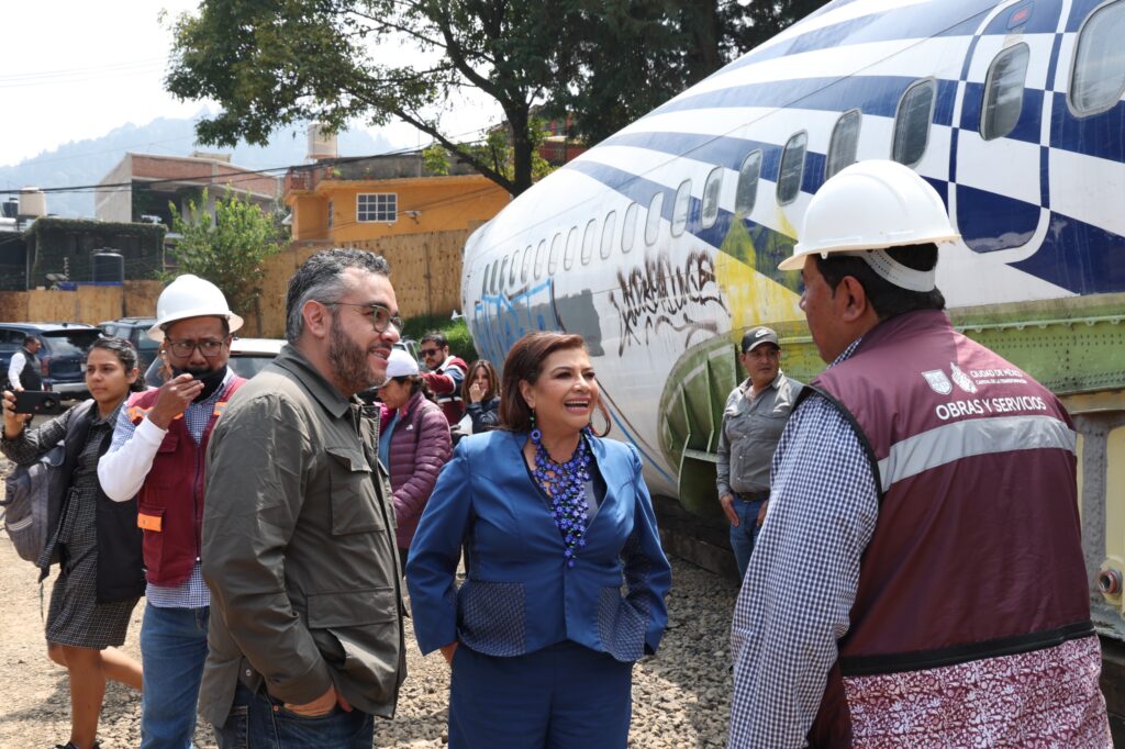 Tomemos el ejemplo más reciente: la Utopía Oyamel en Magdalena Contreras. La escena no tiene desperdicio. Clara Brugada paseando por el terreno junto al alcalde y al secretario de Obras, celebrando con aplausos y promesas lo que apenas es una estructura de columnas y trabes. Ah, pero el golpe de efecto fue la llegada triunfal de un avión reciclado, que servirá como biblioteca, aula digital y, agárrate, como resbaladilla gigante para los niños.