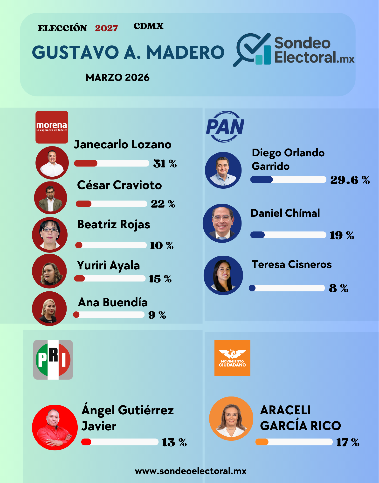 CDMX, 22 abril 2026.- La contienda interna rumbo a la alcaldía Gustavo A. Madero 2027 empieza a reconfigurarse rápidamente. La comparación entre las mediciones de febrero y marzo de 2026 de SondeoElectoral.mx muestra desgaste en liderazgos, movimientos internos relevantes y señales claras de competencia real dentro de Morena y el PAN, mientras el PRI permanece sin impulso visible 📊.