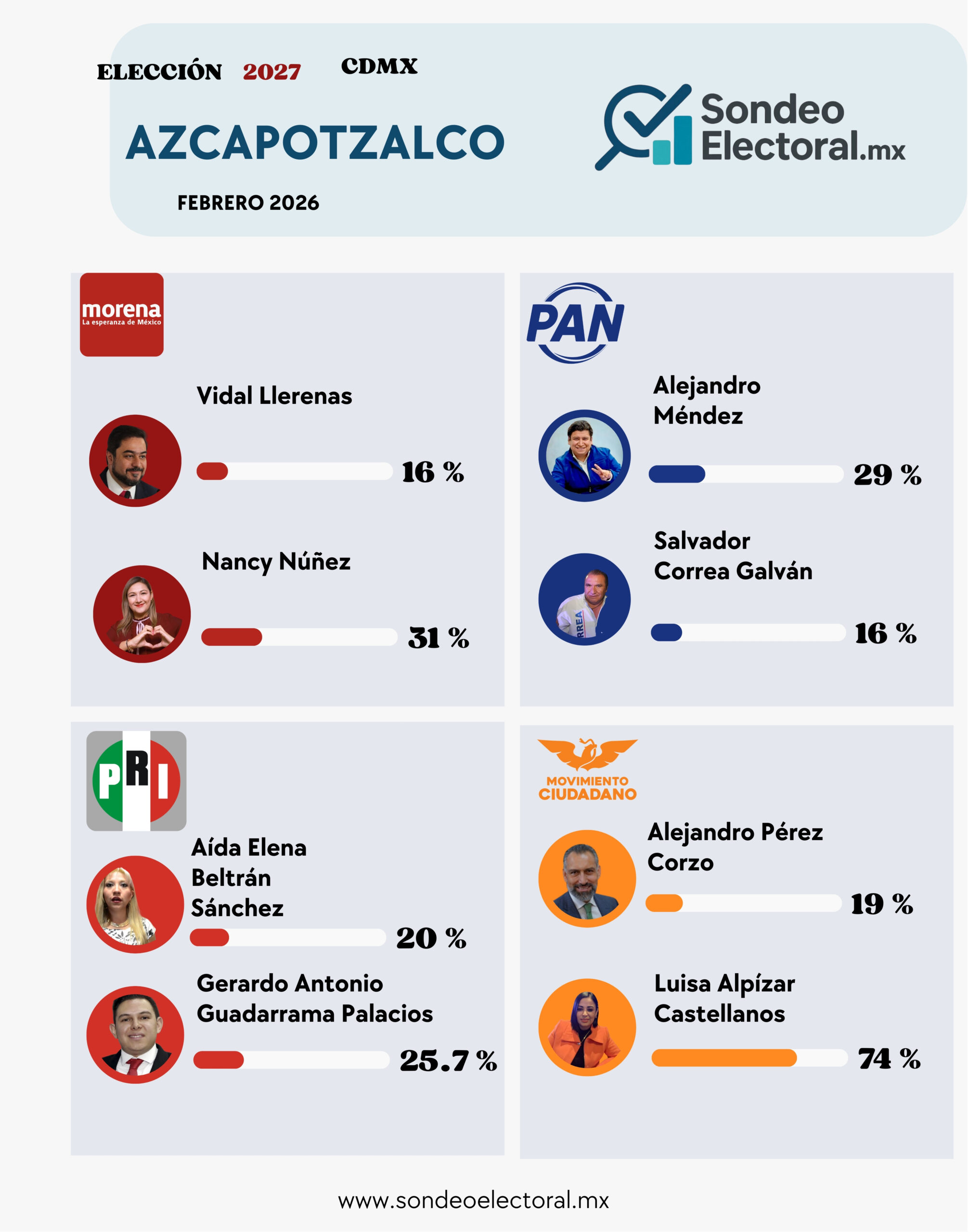 CDMX, 18 marzo 2026.- La nueva medición de Sondeo Electoral para Azcapotzalco deja un dato incómodo para Morena: Nancy Núñez aparece al frente con 31%, pero lejos de consolidarse, su ventaja revela un liderazgo frágil y cuestionado al interior del partido.