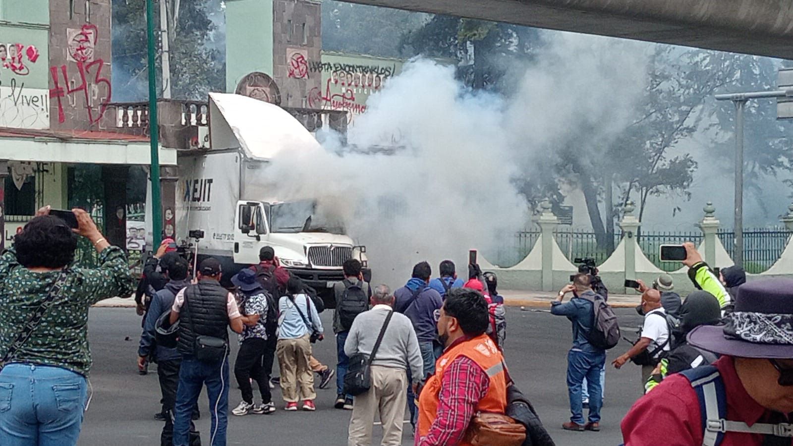 CDMX, 25 septiembre 2025.- En el marco del onceavo aniversario de la desaparición de los 43 estudiantes de Ayotzinapa, normalistas de la Escuela Rural «Raúl Isidro Burgos» protagonizaron una protesta este miércoles 25 de septiembre frente al Campo Militar número 1, en la Ciudad de México, donde incendiaron un camión y lanzaron petardos contra la fachada del recinto militar.