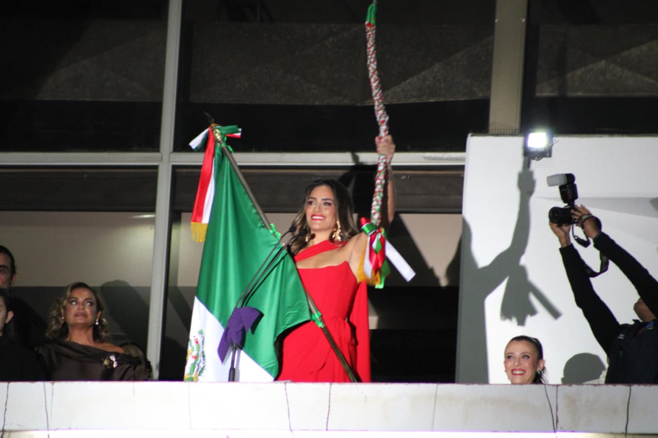 En punto de las 10:50 de la noche, Rojo de la Vega recibió el Lábaro Patrio de manos de una escolta conformada por jóvenes estudiantes. El acto, solemne y simbólico, fue protagonizado exclusivamente por mujeres, lo que dio un mensaje claro sobre inclusión y liderazgo femenino. Con el estandarte en alto, la alcaldesa caminó hasta el balcón central del edificio de gobierno, donde ya la esperaban miles de familias con banderas, rostros pintados y un espíritu patrio desbordante.