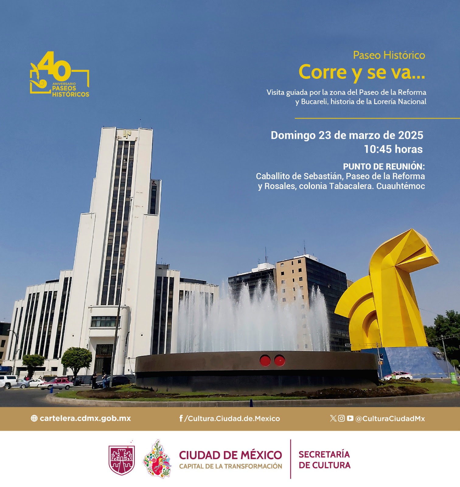 Mientras que el domingo 23 de marzo se llevará a cabo la visita guiada “Corre y se va”, por Paseo de la Reforma al cruce con Rosales y Bucareli, esquina que ha sido testigo de grandes cambios urbanísticos. Esta zona de la ciudad ha tenido edificios y monumentos representativos de distintos momentos de la historia, como la estatua ecuestre de Carlos IV, los Indios Verdes, la residencia de Ignacio de la Torre y Mier, entre otros, que han dado paso al edificio art decó de la Lotería Nacional, la escultura Puerta 1808 del artista zacatecano Manuel Felguérez, el Caballito de Sebastián y el edificio del periódico Excélsior.